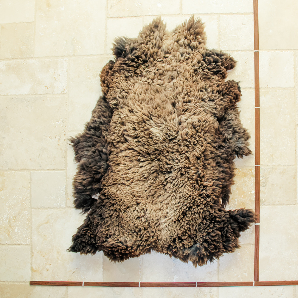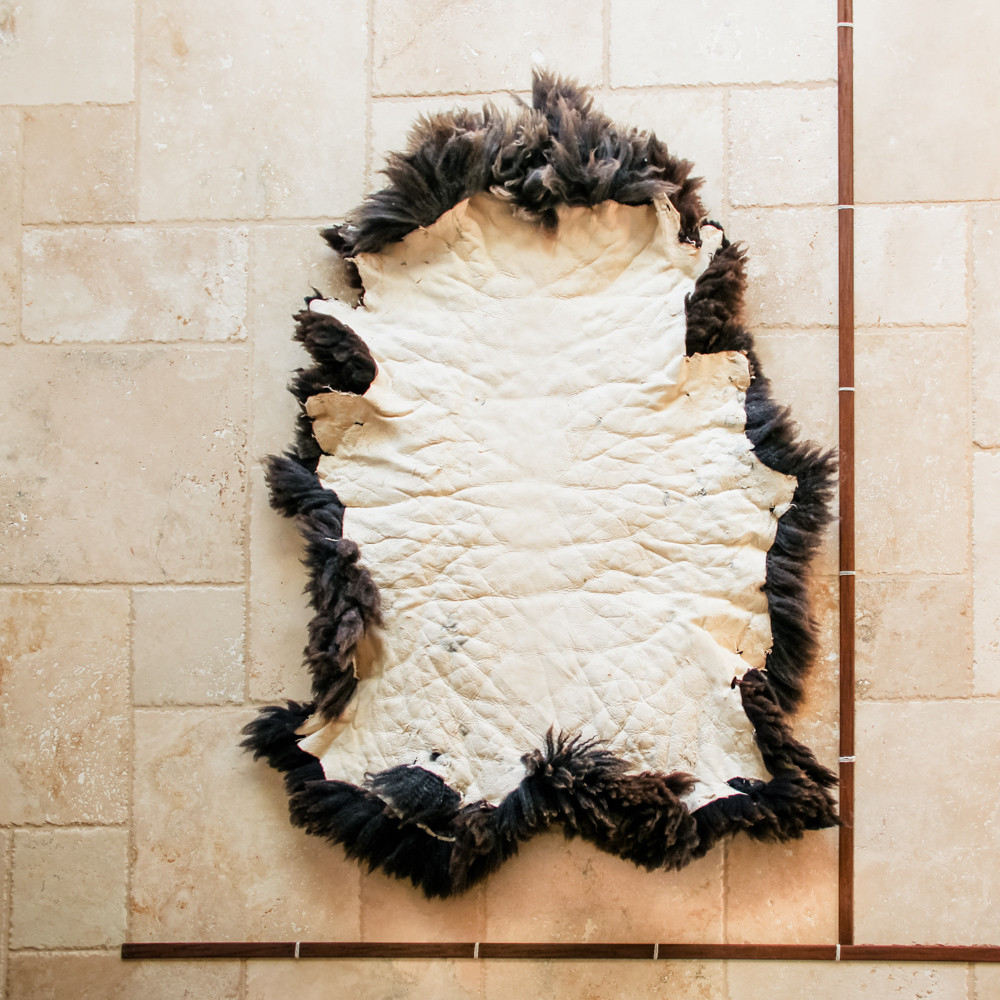 Each hide is a one-of-a-kind natural product. They vary in size and texture. Photos below are taken from this sheep skin, specifically. Wooden sticks with 1-foot markings demonstrate the size of each sheep skin.