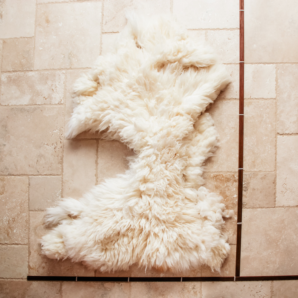 Each hide is a one-of-a-kind natural product. They vary in size and texture. Photos below are taken from this sheep skin, specifically. Wooden sticks with 1-foot markings demonstrate the size of each sheep skin.
