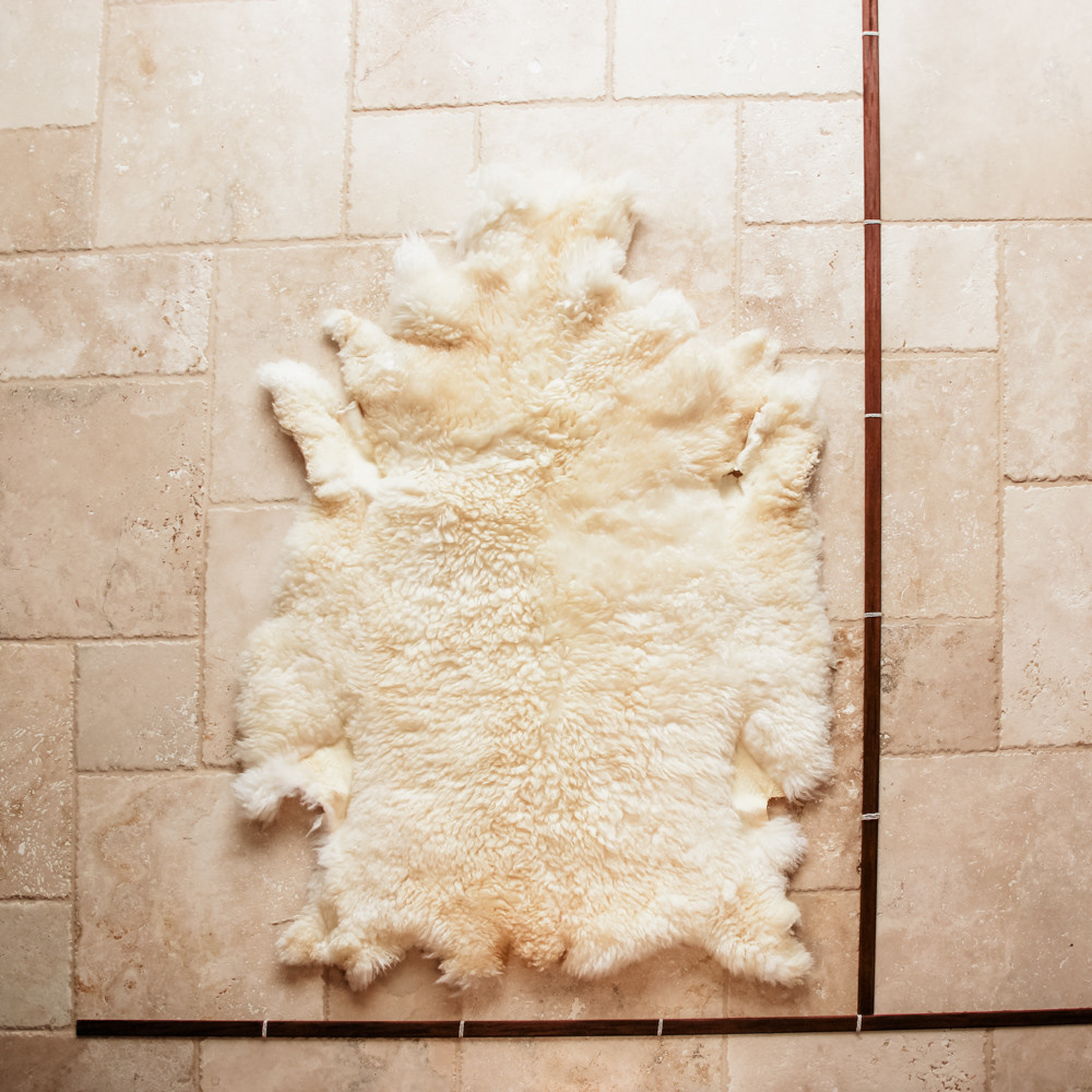 Each hide is a one-of-a-kind natural product. They vary in size and texture. Photos below are taken from this sheep skin, specifically. Wooden sticks with 1-foot markings demonstrate the size of each sheep skin.